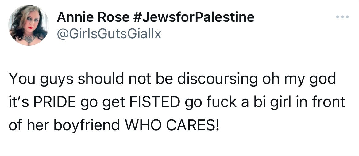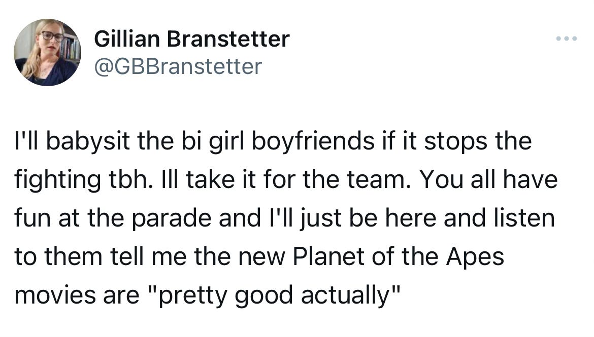 Every year on Twitter, as the clock strikes June 1st, morbidly online weirdos bring the rainbow flag to half mast as they discourse about who is and isn’t “allowed” at Pride — a public event which was formerly understood to be a place where queer people were seen alongside their allies to show they weren’t alone. Now, according to certain loud voices on Twitter who I suspect don’t spend a lot of time in any irl queer spaces, Pride is supposed to be a space where everyone’s queer card is stamped at the door so they can go in and talk about their feelings over the pumping music, spilled beer, and blatant corporate sponsorship.