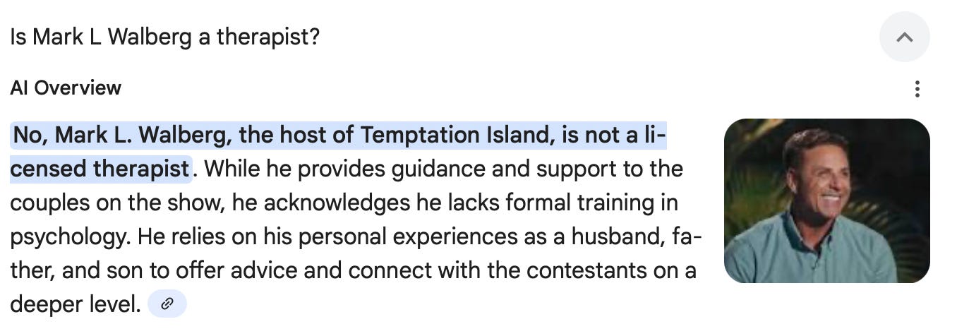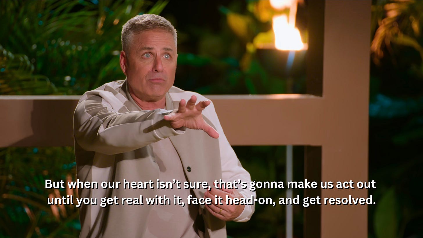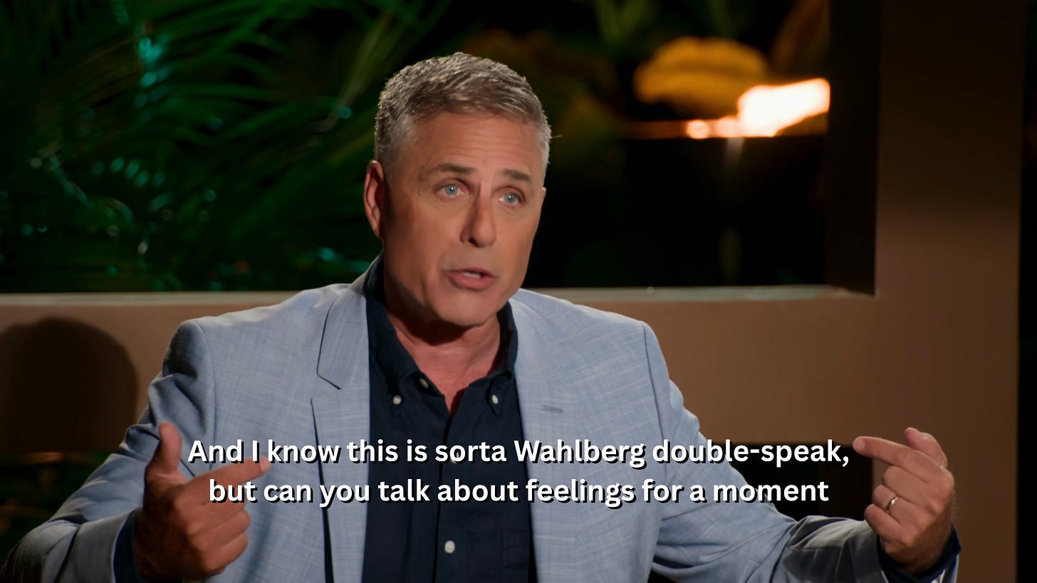 The women receive plenty of Walbergian Wisdom as well, but it’s the boys I’m most fascinated by. Reaching young men these days is notoriously difficult. Conventionally handsome young men in their twenties who are willing to go on a reality show called Temptation Island are probably one of our worst demographics. But Mark really got through to them by validating them, then pushing them towards a vision of masculinity that is vulnerable, but also involves accountability. That’s the problem right now with dudes getting just enough therapy language to become worse but with a better gaslighting vocabulary — they’ve gotten the message about being vulnerable but aren’t ready to take responsibility for themselves. Putting both of these things together is clearly what has assisted former Antiques Roadshow host Mark L. Walberg in having a 38 year marriage. 38 years!!! The guy has the juice!