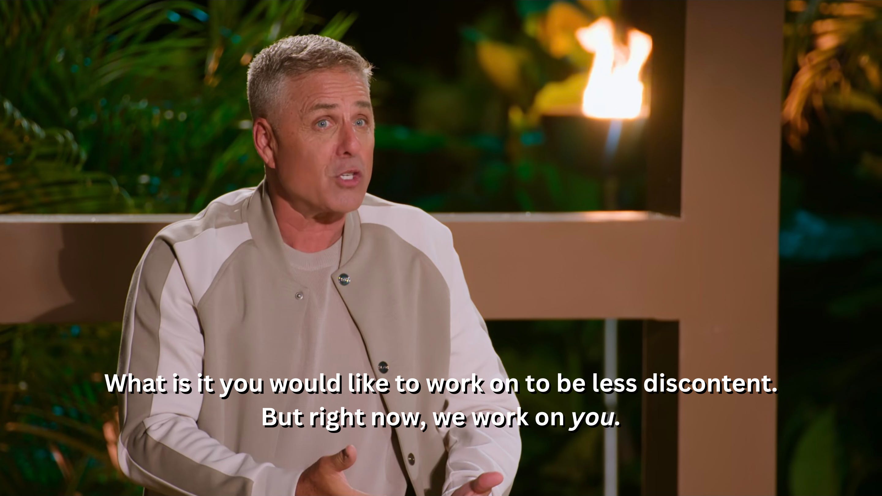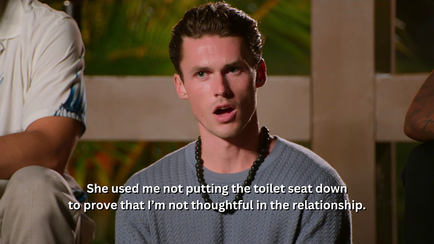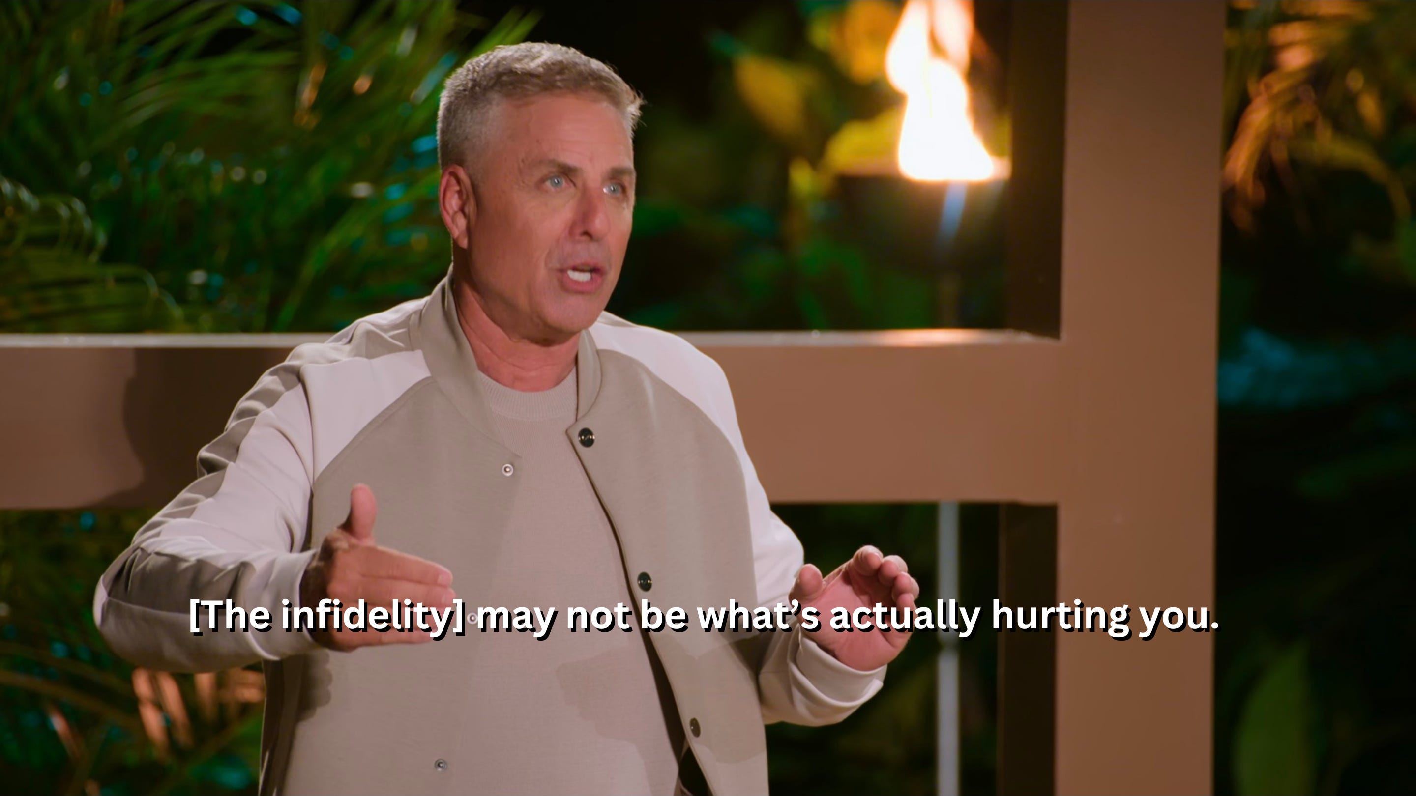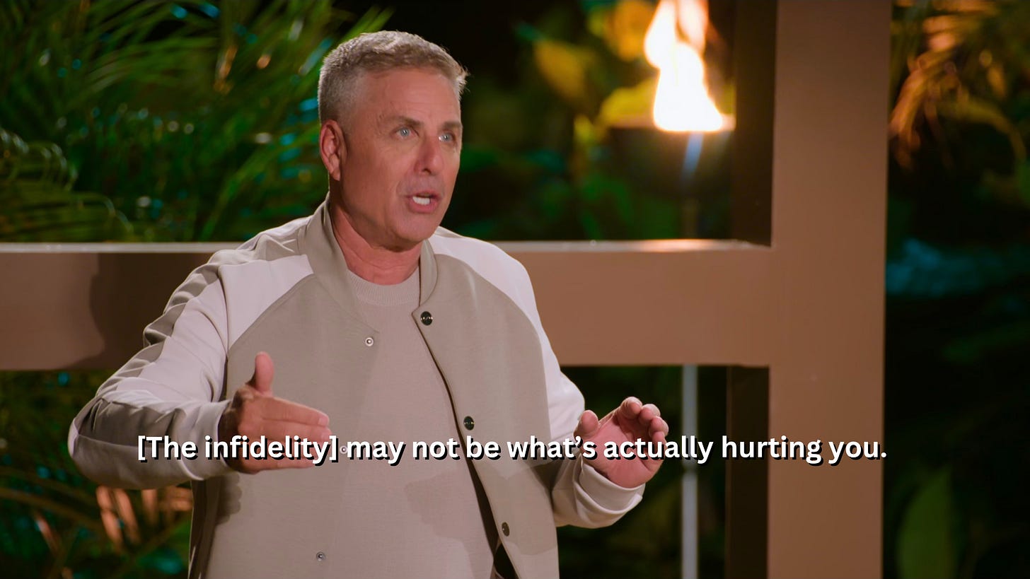 From that first bonfire onward, the show follows these turds as they genuinely undergo exactly as much personal growth as I think they were probably capable of in the few weeks they were defiling the island of Hawaii with this shit show. Assisted by emotional assassin Mark L. Walberg, the boys are pushed to examine their own role in the dysfunction they’re experiencing in their relationships. A lot of other reality shows conspire to make contestants worse by plying them with alcohol and manipulative producers while simultaneously laying on the pressure to be monogamous and virtuous (I have a graph about this in my article about The Ultimatum). This show on the other hand seems, against all the odds, actually pretty invested in the wellbeing of its participants (as much as a show that plays clips of infidelity at a bonfire can).