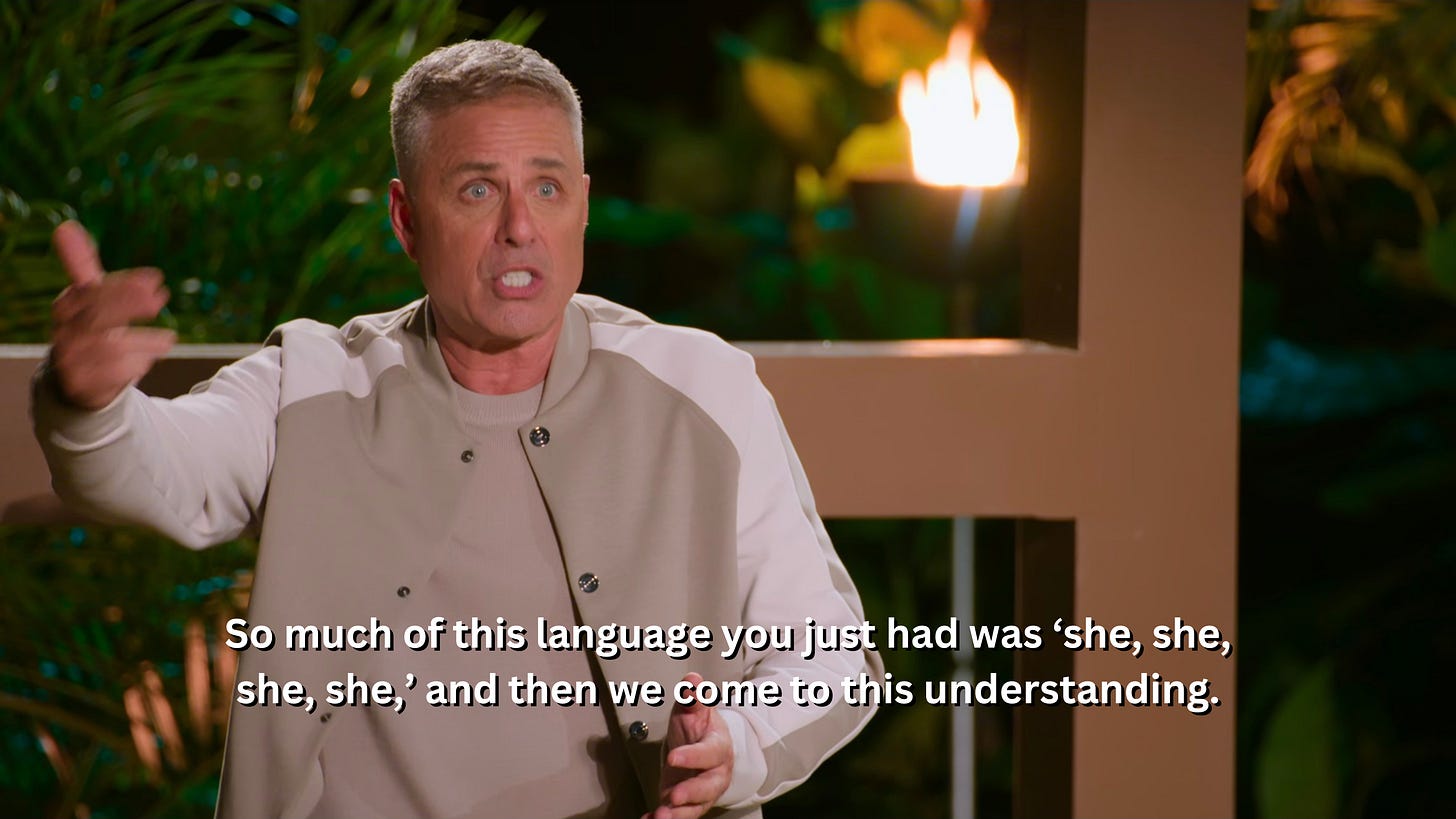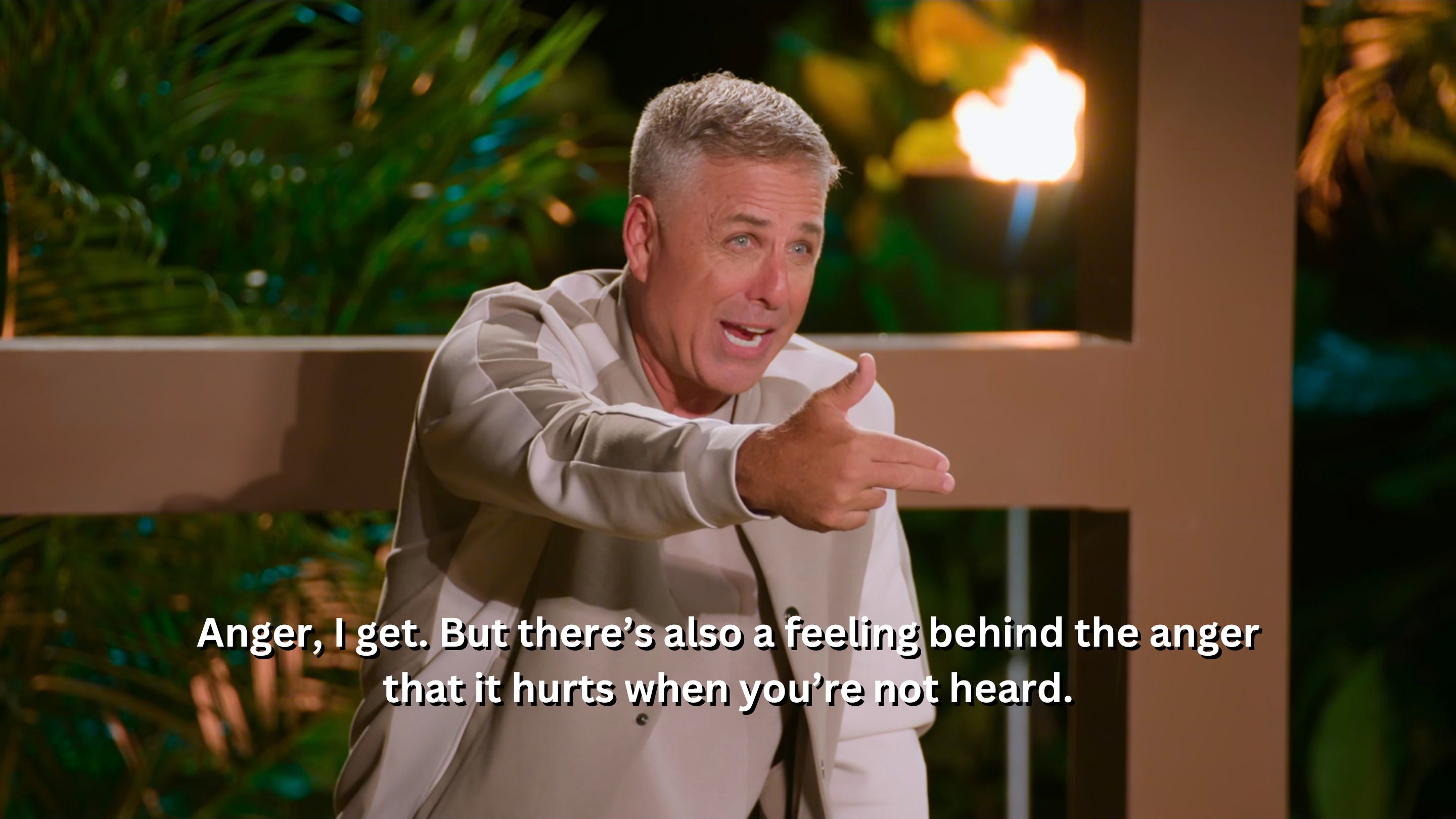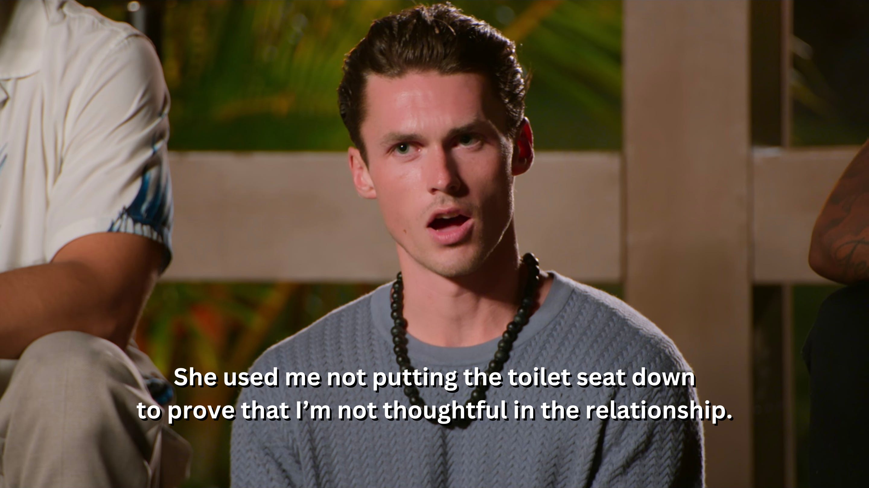 From that first bonfire onward, the show follows these turds as they genuinely undergo exactly as much personal growth as I think they were probably capable of in the few weeks they were defiling the island of Hawaii with this shit show. Assisted by emotional assassin Mark L. Walberg, the boys are pushed to examine their own role in the dysfunction they’re experiencing in their relationships. A lot of other reality shows conspire to make contestants worse by plying them with alcohol and manipulative producers while simultaneously laying on the pressure to be monogamous and virtuous (I have a graph about this in my article about The Ultimatum). This show on the other hand seems, against all the odds, actually pretty invested in the wellbeing of its participants (as much as a show that plays clips of infidelity at a bonfire can).